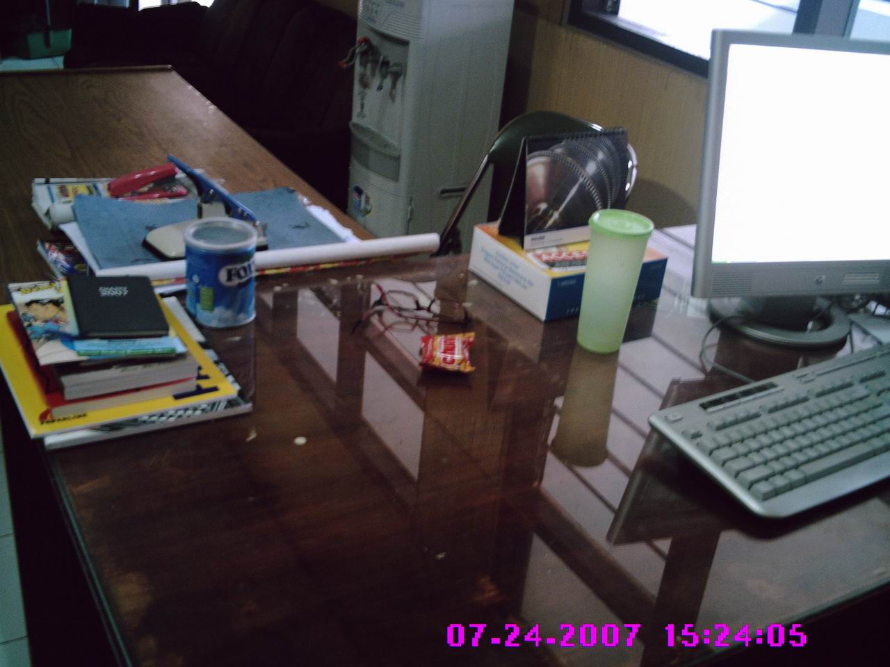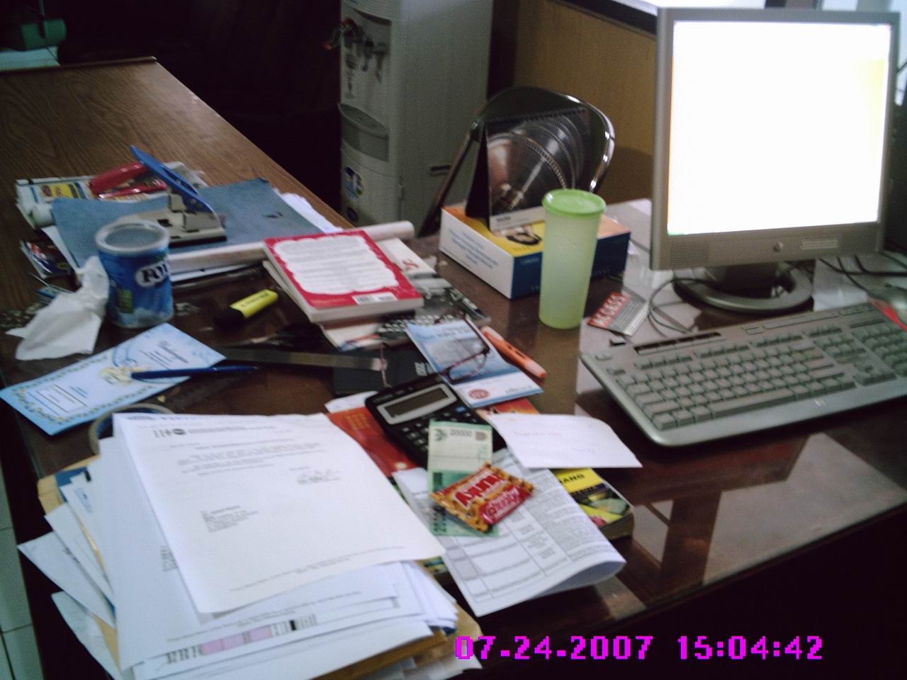keadaan mejaku sebelum dibersihkan. Ada undangan pernikahan, surat-surat dan tumpukan workplan. Ada juga kalkulator untuk menghitung utang-utang. Dan ehm…. ada juga kotak kondom yang isinya tinggal separuh. Tapi saudara-saudara, jangan salah paham dulu. Saya bukan juragan kondom, kebetulan saja ada NGO yang menyuplai mengirimkan contoh kondom yang mereka distribusikan.