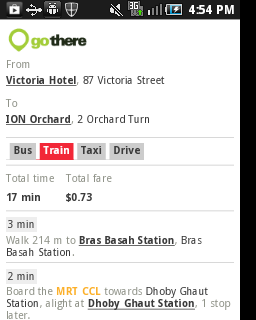 Aplikasi yang sangat membantu saya selama berada di Singapura adalah gothere.sg . Kalau punya smartphone aplikasi ini bisa digunakan. Lebih enak lagi kalau punya iphone karena aplikasinya tersedia. tetapi kalau memakai smartphone yang lain aplikasi ini bisa dipakai juga versi mobilnya. Enaknya aplikasi ini adalah kita tinggal memasukkan lokasi awal kita dan tujuan kita. setelah memasukkan alamat, aplikasi ini akan memberitahukan alternatif beserta biaya. Jadi kalau misalnya ingin naik bus, maka akan diberitahu rutenya ke mana saja. begitu juga kalau akan naik MRT termasuk transit di stasiun mana. Begitupun kalau kita ingin naik taksi, maka aplikasi ini akan memberitahukan estimasi biaya taksinya. Dan dari pengalaman saya, biaya yang dibayar dengan perkiraan dari aplikasi ini tidak terlalu berbeda jauh.