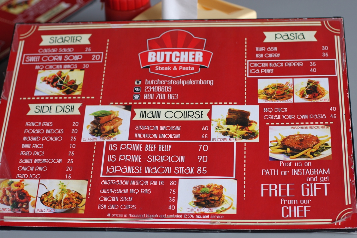 Kali kedua, saya diajak salah seorang sahabat saya yang sedang pulang kampung untuk makan di sini. butcher steak tidak menggunakan AC namun tidak terlalu panas karena bentuknya yang terbuka. begitu datang, pelayan langsung memberikan daftar menu. Selain menu yang ada di daftar menu, ada juga Chef’ Special yang bisa berganti-ganti. Soal Chef’ special ini bisa dilihat di papan menu ataupun ditanyakan pada pelayannya. Kalau dilihat-lihat, penataan di tempat ini mirip dengan la vita bella. ternyata memang butcher merupakan bagian dari keluarga la vita bella.