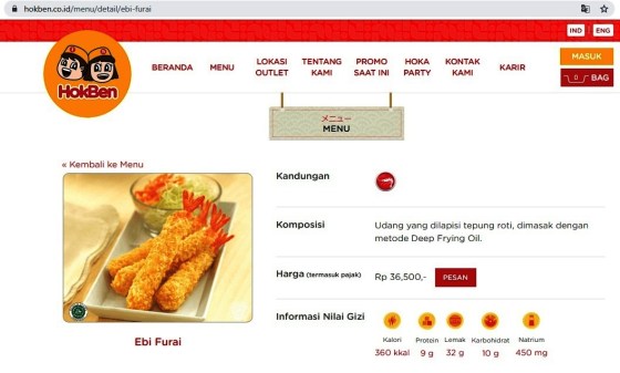 Fakta Nutrisi masing-masing menu tersedia di situs Hokben