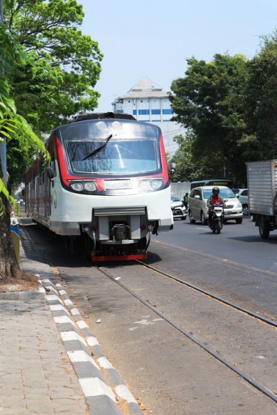 Kereta Bathara Kresna melintasi jalan Slamet Riyadi Solo