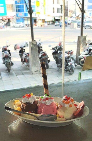 Setelah puas foto-foto dan istirahat sebentar, saya jalan kaki lagi menuju pasar Triwindu. Jalannya pelan-pelan sambil menikmati pemandangan sekitar. Dari pasar Triwindu saya sampai ke tujuan saya berikutnya, mencoba es krim legendaris di Solo. New Es Krim Tentrem yang berada di jalan Slamet Riyadi merupakan cabang dari es krim tentrem yang berada di Jalan Urip Sumoharjo. Hari yang panas berasa adem dengan makan es krim banana split. Saya memilih duduk di depan jendela menghadap jalan Slamet Riyadi, memandangi kendaraan yang lalu lalang di depan.